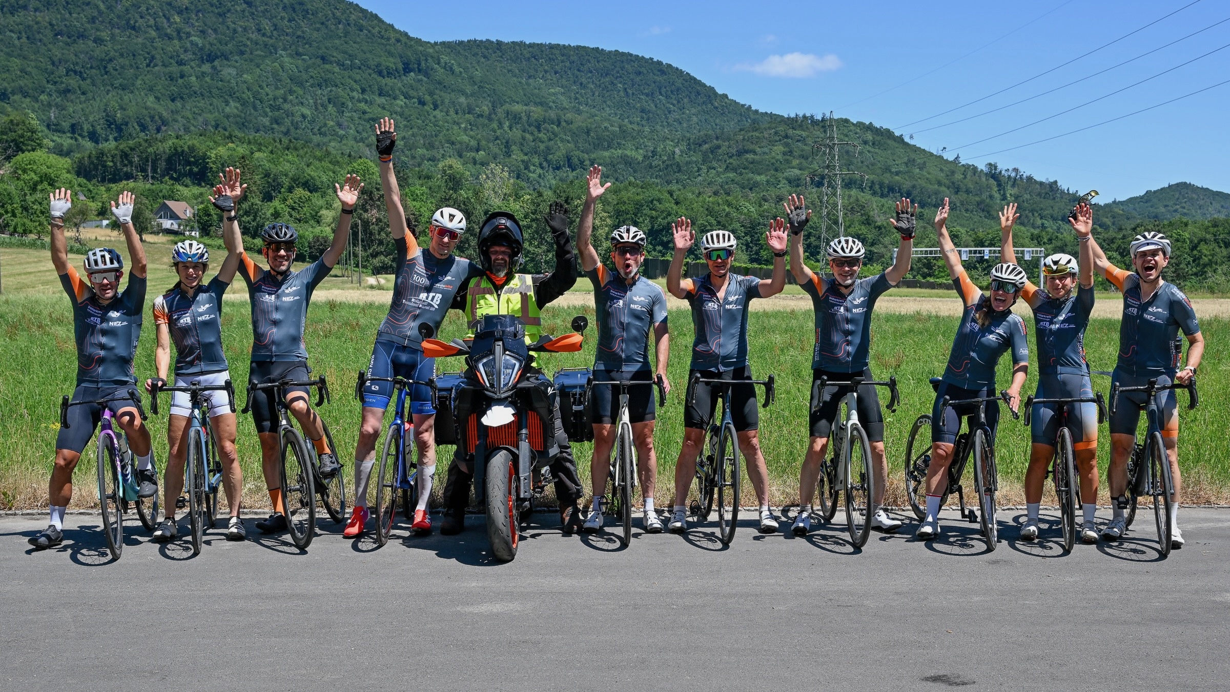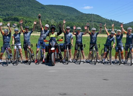 - Teamgeist: Während der 1. und der 6. Etappe trugen alle Radfahrer:inne unser Trikot mit den zahlreichen darauf abgebildeten Sponsoren. Das war sehr eindrucksvoll, und alle Teilnehmenden wurden durch unseren Fotografen, Uwe Zinke, bestens in Szene gesetzt. Die entstandenen Bilder sind grossartig.