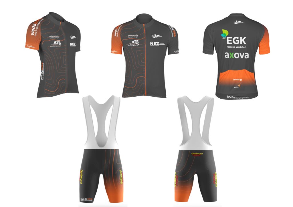Trikots und Hosen werden wiederum bei TEXmarket produziert. Das für 2024 neu gewählte Sitzpolster der Hosen hat sich gut bewährt und wird so beibehalten.